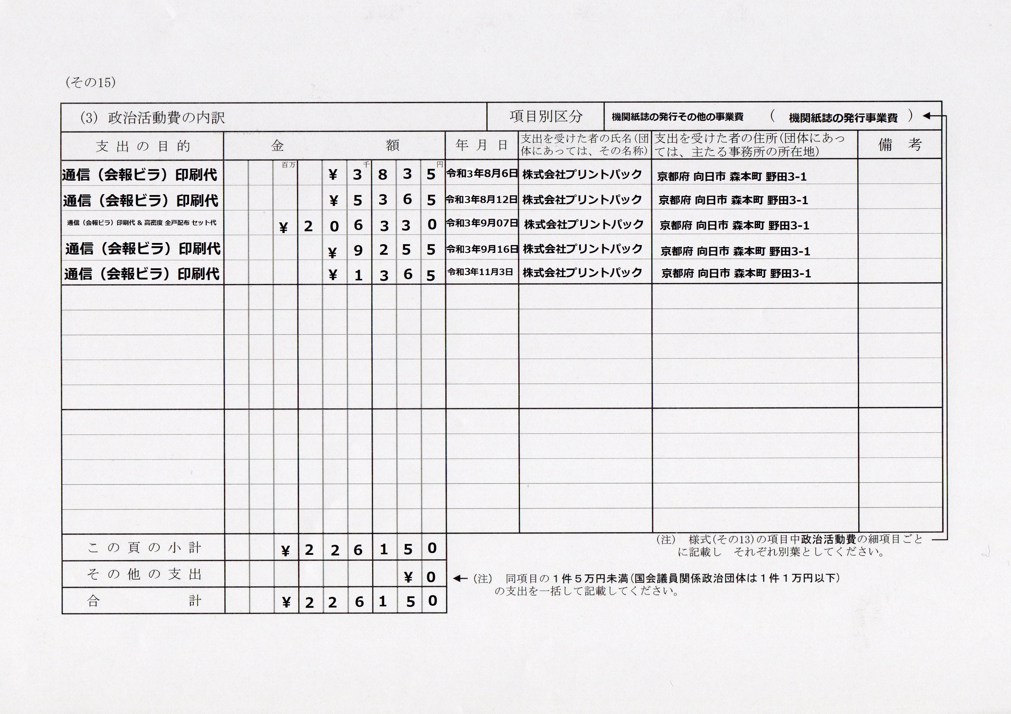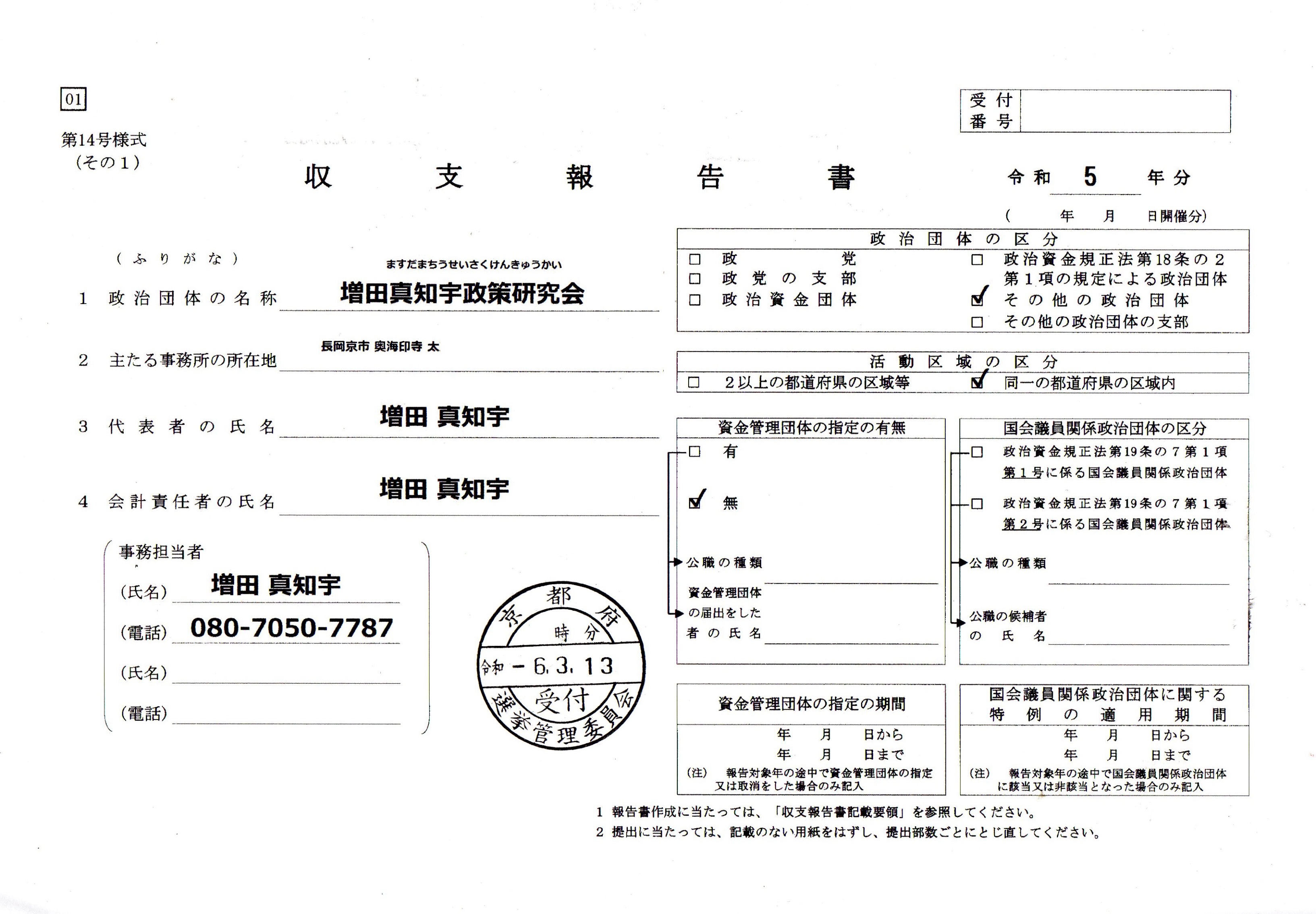 増田真知宇政策研究会 会報印刷代23万6985園.。3万部以上 印刷し、全戸投函(全戸ポスティング)し、また増田真知宇自身が朝 駅前で配りました。